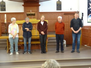 Op de foto staan de volgende organisten van links naar rechts: Caroline Schaap. Hans Stehouwer,Jan Zwart,Sebastiaan Schippers en Hanneke Muntjewerf (Kerst 2024: 31 jaar vaste organist geweest).